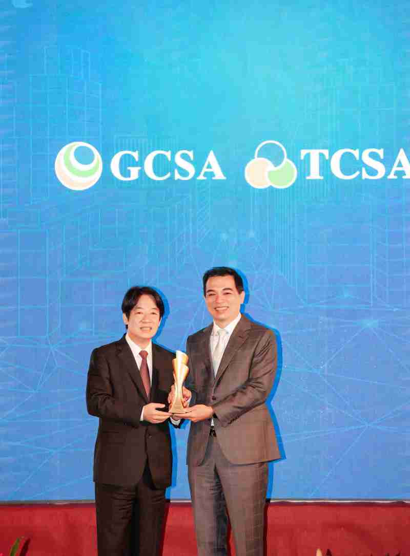 达全方位永续表现获全球永续奖及台湾永续奖肯定,,,,由副总统赖清德颁奖 (左),,,,CG电子总经理柯富仁 (右) 代表领奖