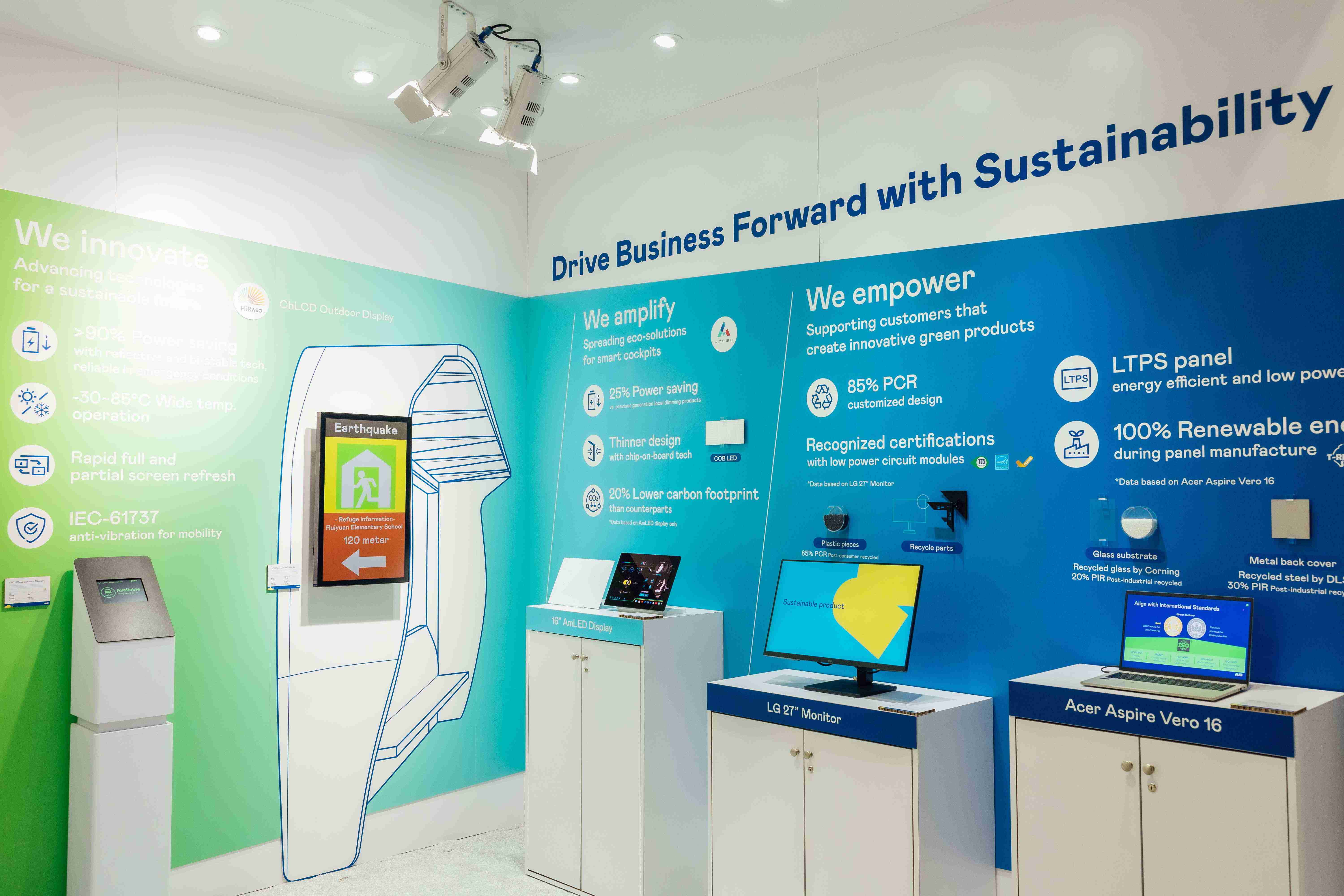 CG电子运用创新显示技术HiRaso胆固醇液晶双稳态技术达到显示零耗能、、、、扩大节能省电的AmLED显示技术应用于车用产品、、、、以再生的消费后回收(PCR)塑料及全绿电生产之面板,,,应用于笔电及萤幕,,增加绿色价值。。