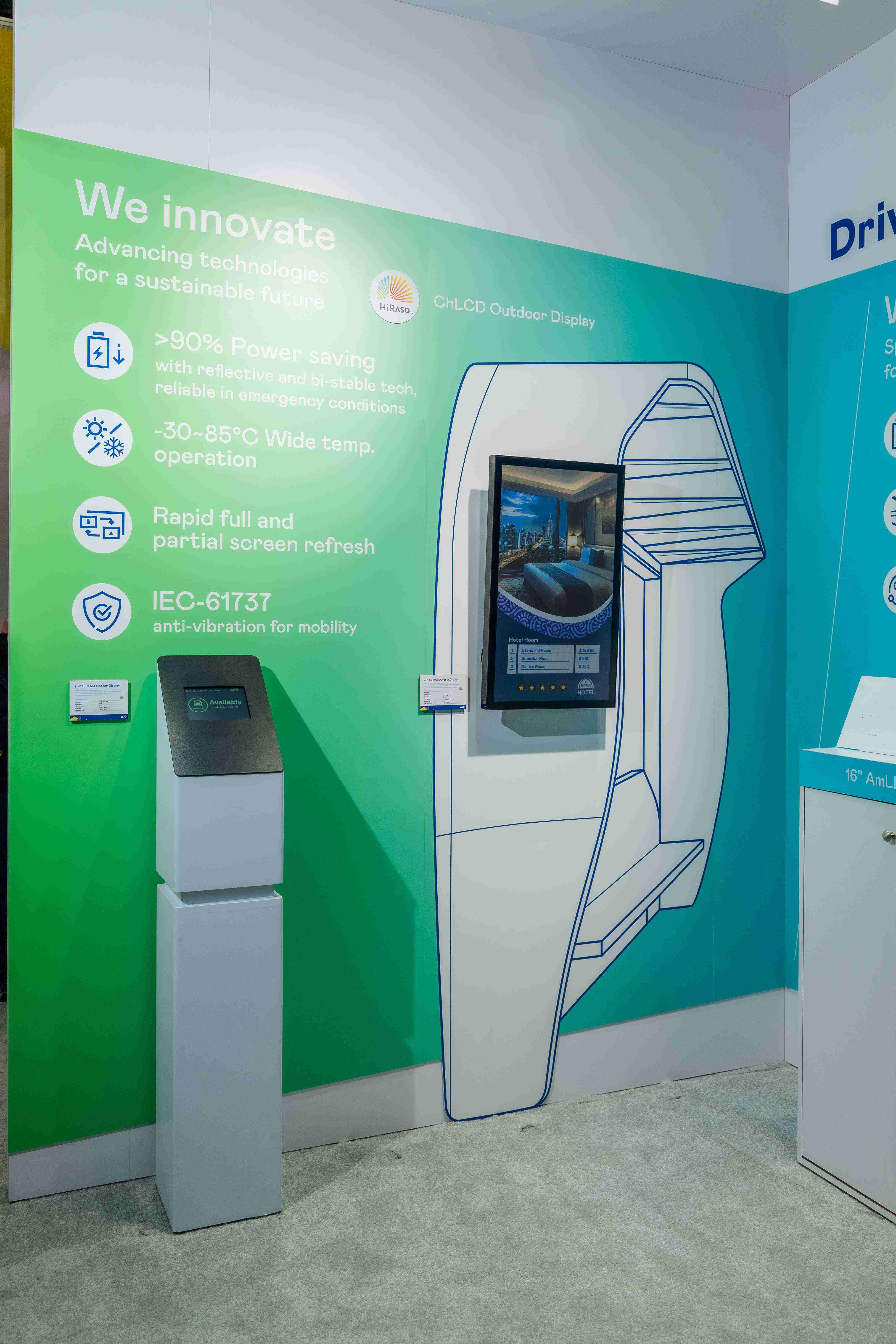HiRaso胆固醇液晶显示器运用反射环境光线的方式,,,呈现影像显示时零耗能的环保省电诉求,,,,光线愈强愈能呈现绝佳的色彩饱和度及显示效果,,,,同时在摄氏-30度至85度间宽温的使用优势,,,,为户外电子看板的新首选。。。。