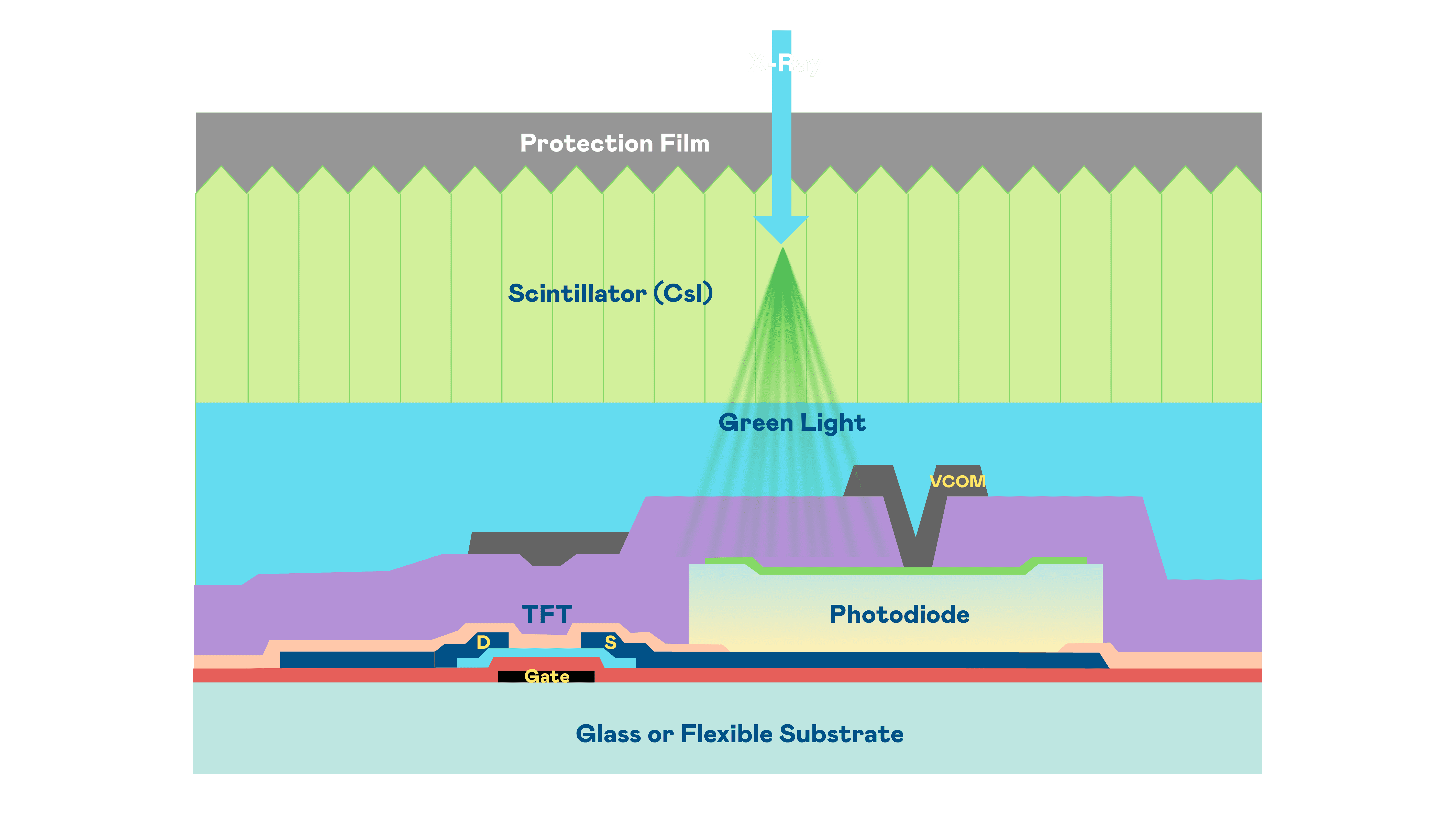 CG电子的X光影像感测阵列使用薄膜电晶体 (TFT) 作为每个像素的读取开关,,,搭配光电二极体(Photodiode)的光电转换元件,,用以感测X光影像讯号。。
